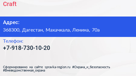 Craft по адресу 368300, Дагестан, Махачкала, Ленина, 70а в дальнейшем Организация, размещена в следующих категориях: