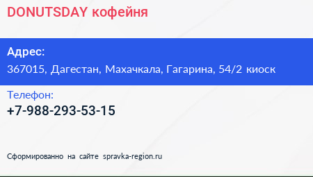 DONUTSDAY, кофейня по адресу 367015, Дагестан, Махачкала, Гагарина, 54/2 киоск в дальнейшем Организация, размещена в следующих категориях: