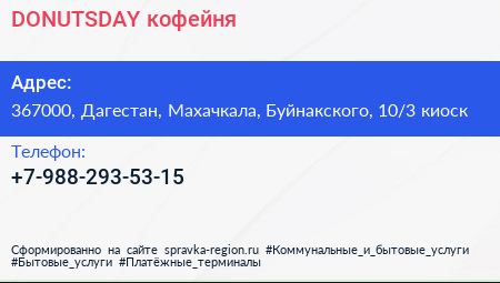 DONUTSDAY, кофейня по адресу 367000, Дагестан, Махачкала, Буйнакского, 10/3 киоск в дальнейшем Организация, размещена в следующих категориях: