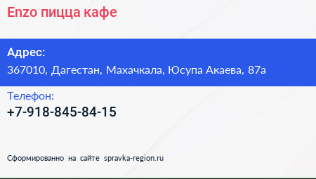 Enzo-пицца, кафе по адресу 367010, Дагестан, Махачкала, Юсупа Акаева, 87а в дальнейшем Организация, размещена в следующих категориях: