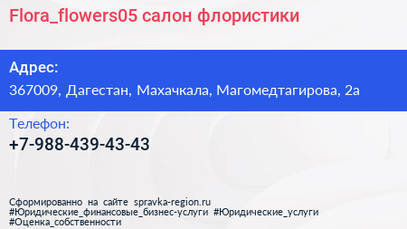 Flora_flowers05, салон флористики по адресу 367009, Дагестан, Махачкала, Магомедтагирова, 2а в дальнейшем Организация, размещена в следующих категориях: