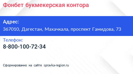 Фонбет, букмекерская контора по адресу 367010, Дагестан, Махачкала, проспект Гамидова, 73 в дальнейшем Организация, размещена в следующих категориях:
