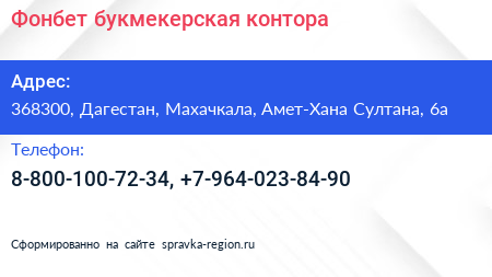 Фонбет, букмекерская контора по адресу 368300, Дагестан, Махачкала, Амет-Хана Султана, 6а в дальнейшем Организация, размещена в следующих категориях: