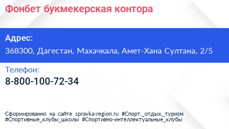 Фонбет, букмекерская контора по адресу 368300, Дагестан, Махачкала, Амет-Хана Султана, 2/5 в дальнейшем Организация, размещена в следующих категориях:
