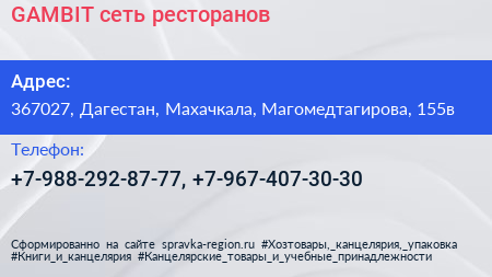 GAMBIT, сеть ресторанов по адресу 367027, Дагестан, Махачкала, Магомедтагирова, 155в в дальнейшем Организация, размещена в следующих категориях: