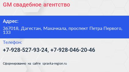 GM, свадебное агентство по адресу 367018, Дагестан, Махачкала, проспект Петра Первого, 133 в дальнейшем Организация, размещена в следующих категориях: