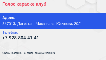 Голос, караоке-клуб по адресу 367013, Дагестан, Махачкала, Юсупова, 20/1 в дальнейшем Организация, размещена в следующих категориях: