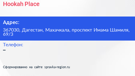 Hookah Place по адресу 367030, Дагестан, Махачкала, проспект Имама Шамиля, 69/3 в дальнейшем Организация, размещена в следующих категориях: