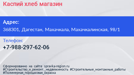 Каспий-хлеб, магазин по адресу 368301, Дагестан, Махачкала, Махачкалинская, 98/1 в дальнейшем Организация, размещена в следующих категориях: