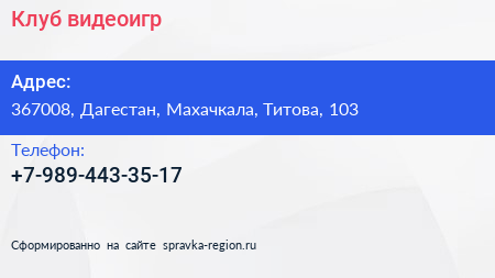Клуб видеоигр по адресу 367008, Дагестан, Махачкала, Титова, 103 в дальнейшем Организация, размещена в следующих категориях: