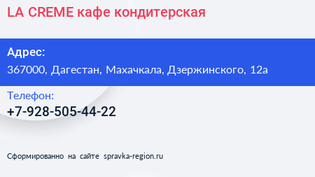 LA CREME, кафе-кондитерская по адресу 367000, Дагестан, Махачкала, Дзержинского, 12а в дальнейшем Организация, размещена в следующих категориях: