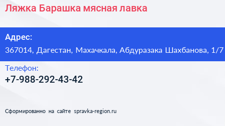 Ляжка Барашка, мясная лавка по адресу 367014, Дагестан, Махачкала, Абдуразака Шахбанова, 1/7 в дальнейшем Организация, размещена в следующих категориях: