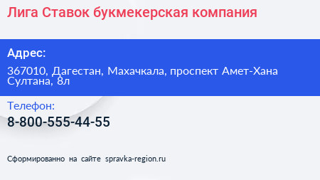 Лига Ставок, букмекерская компания по адресу 367010, Дагестан, Махачкала, проспект Амет-Хана Султана, 8л в дальнейшем Организация, размещена в следующих категориях: