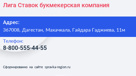 Лига Ставок, букмекерская компания по адресу 367008, Дагестан, Махачкала, Гайдара Гаджиева, 11м в дальнейшем Организация, размещена в следующих категориях: