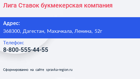 Лига Ставок, букмекерская компания по адресу 368300, Дагестан, Махачкала, Ленина, 52г в дальнейшем Организация, размещена в следующих категориях:
