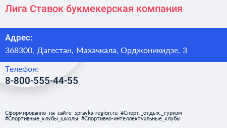 Лига Ставок, букмекерская компания по адресу 368300, Дагестан, Махачкала, Орджоникидзе, 3 в дальнейшем Организация, размещена в следующих категориях: