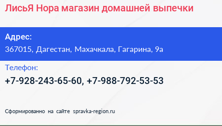 ЛисьЯ Нора, магазин домашней выпечки по адресу 367015, Дагестан, Махачкала, Гагарина, 9а в дальнейшем Организация, размещена в следующих категориях: