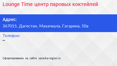 Lounge Time, центр паровых коктейлей по адресу 367015, Дагестан, Махачкала, Гагарина, 50а в дальнейшем Организация, размещена в следующих категориях: