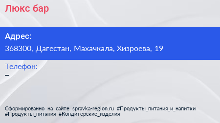 Люкс, бар по адресу 368300, Дагестан, Махачкала, Хизроева, 19 в дальнейшем Организация, размещена в следующих категориях: