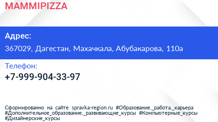 MAMMIPIZZA по адресу 367029, Дагестан, Махачкала, Абубакарова, 110а в дальнейшем Организация, размещена в следующих категориях: