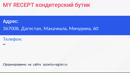 MY RECEPT, кондитерский бутик по адресу 367008, Дагестан, Махачкала, Мичурина, 60 в дальнейшем Организация, размещена в следующих категориях: