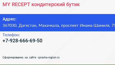 MY RECEPT, кондитерский бутик по адресу 367030, Дагестан, Махачкала, проспект Имама Шамиля, 75 в дальнейшем Организация, размещена в следующих категориях: