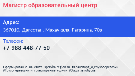 Магистр, образовательный центр по адресу 367010, Дагестан, Махачкала, Гагарина, 70в в дальнейшем Организация, размещена в следующих категориях: