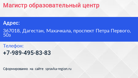 Магистр, образовательный центр по адресу 367018, Дагестан, Махачкала, проспект Петра Первого, 50з в дальнейшем Организация, размещена в следующих категориях: