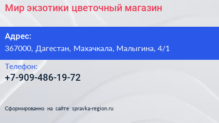 Мир экзотики, цветочный магазин по адресу 367000, Дагестан, Махачкала, Малыгина, 4/1 в дальнейшем Организация, размещена в следующих категориях:
