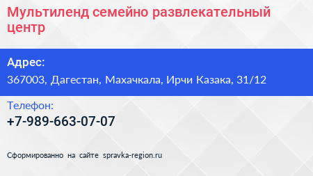 Мультиленд, семейно-развлекательный центр по адресу 367003, Дагестан, Махачкала, Ирчи Казака, 31/12 в дальнейшем Организация, размещена в следующих категориях: