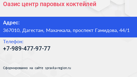 Оазис, центр паровых коктейлей по адресу 367010, Дагестан, Махачкала, проспект Гамидова, 44/1 в дальнейшем Организация, размещена в следующих категориях: