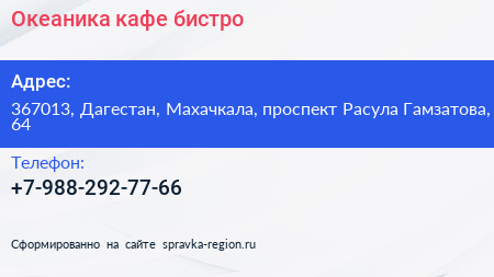 Океаника, кафе-бистро по адресу 367013, Дагестан, Махачкала, проспект Расула Гамзатова, 64 в дальнейшем Организация, размещена в следующих категориях: