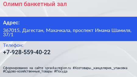 Олимп, банкетный зал по адресу 367015, Дагестан, Махачкала, проспект Имама Шамиля, 37/1 в дальнейшем Организация, размещена в следующих категориях: