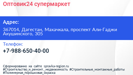 Оптовик24, супермаркет по адресу 367014, Дагестан, Махачкала, проспект Али-Гаджи Акушинского, 305 в дальнейшем Организация, размещена в следующих категориях: