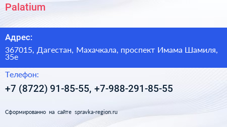 Palatium по адресу 367015, Дагестан, Махачкала, проспект Имама Шамиля, 35е в дальнейшем Организация, размещена в следующих категориях: