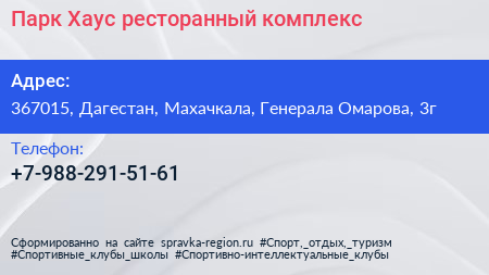 Парк Хаус, ресторанный комплекс по адресу 367015, Дагестан, Махачкала, Генерала Омарова, 3г в дальнейшем Организация, размещена в следующих категориях: