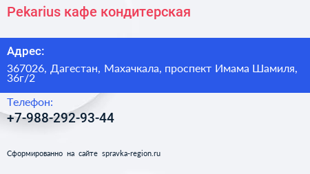 Pekarius, кафе-кондитерская по адресу 367026, Дагестан, Махачкала, проспект Имама Шамиля, 36г/2 в дальнейшем Организация, размещена в следующих категориях:
