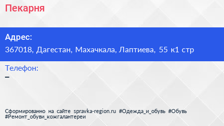 Пекарня по адресу 367018, Дагестан, Махачкала, Лаптиева, 55 к1 стр в дальнейшем Организация, размещена в следующих категориях: