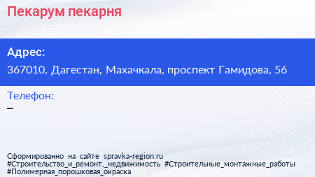Пекарум, пекарня по адресу 367010, Дагестан, Махачкала, проспект Гамидова, 56 в дальнейшем Организация, размещена в следующих категориях: