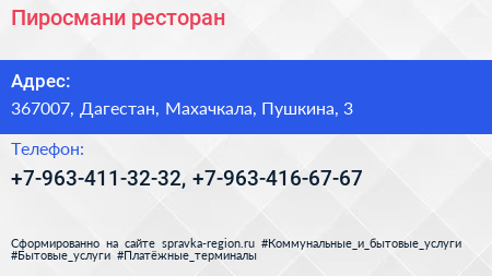 Пиросмани, ресторан по адресу 367007, Дагестан, Махачкала, Пушкина, 3 в дальнейшем Организация, размещена в следующих категориях: