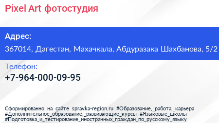 Pixel-Art, фотостудия по адресу 367014, Дагестан, Махачкала, Абдуразака Шахбанова, 5/2 в дальнейшем Организация, размещена в следующих категориях: