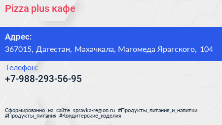 Pizza plus, кафе по адресу 367015, Дагестан, Махачкала, Магомеда Ярагского, 104 в дальнейшем Организация, размещена в следующих категориях: