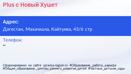 Plus, с. Новый Хушет по адресу Дагестан, Махачкала, Кайтуева, 43/6 стр в дальнейшем Организация, размещена в следующих категориях:
