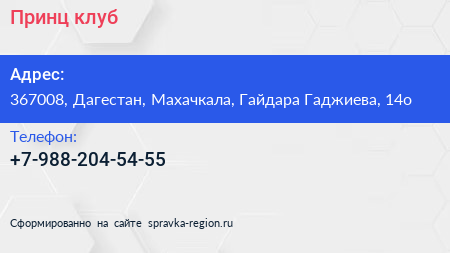 Принц, клуб по адресу 367008, Дагестан, Махачкала, Гайдара Гаджиева, 14о в дальнейшем Организация, размещена в следующих категориях: