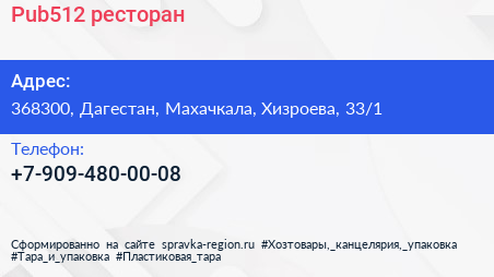 Pub512, ресторан по адресу 368300, Дагестан, Махачкала, Хизроева, 33/1 в дальнейшем Организация, размещена в следующих категориях: