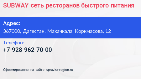 SUBWAY, сеть ресторанов быстрого питания по адресу 367000, Дагестан, Махачкала, Коркмасова, 12 в дальнейшем Организация, размещена в следующих категориях: