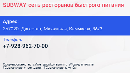 SUBWAY, сеть ресторанов быстрого питания по адресу 367020, Дагестан, Махачкала, Каммаева, 86/3 в дальнейшем Организация, размещена в следующих категориях: