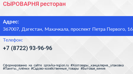СЫРОВАРНЯ, ресторан по адресу 367007, Дагестан, Махачкала, проспект Петра Первого, 16а в дальнейшем Организация, размещена в следующих категориях: