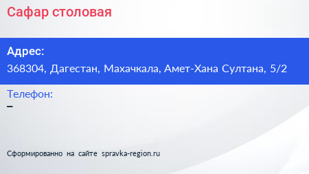 Сафар, столовая по адресу 368304, Дагестан, Махачкала, Амет-Хана Султана, 5/2 в дальнейшем Организация, размещена в следующих категориях: