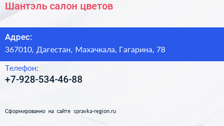 Шантэль, салон цветов по адресу 367010, Дагестан, Махачкала, Гагарина, 78 в дальнейшем Организация, размещена в следующих категориях:
